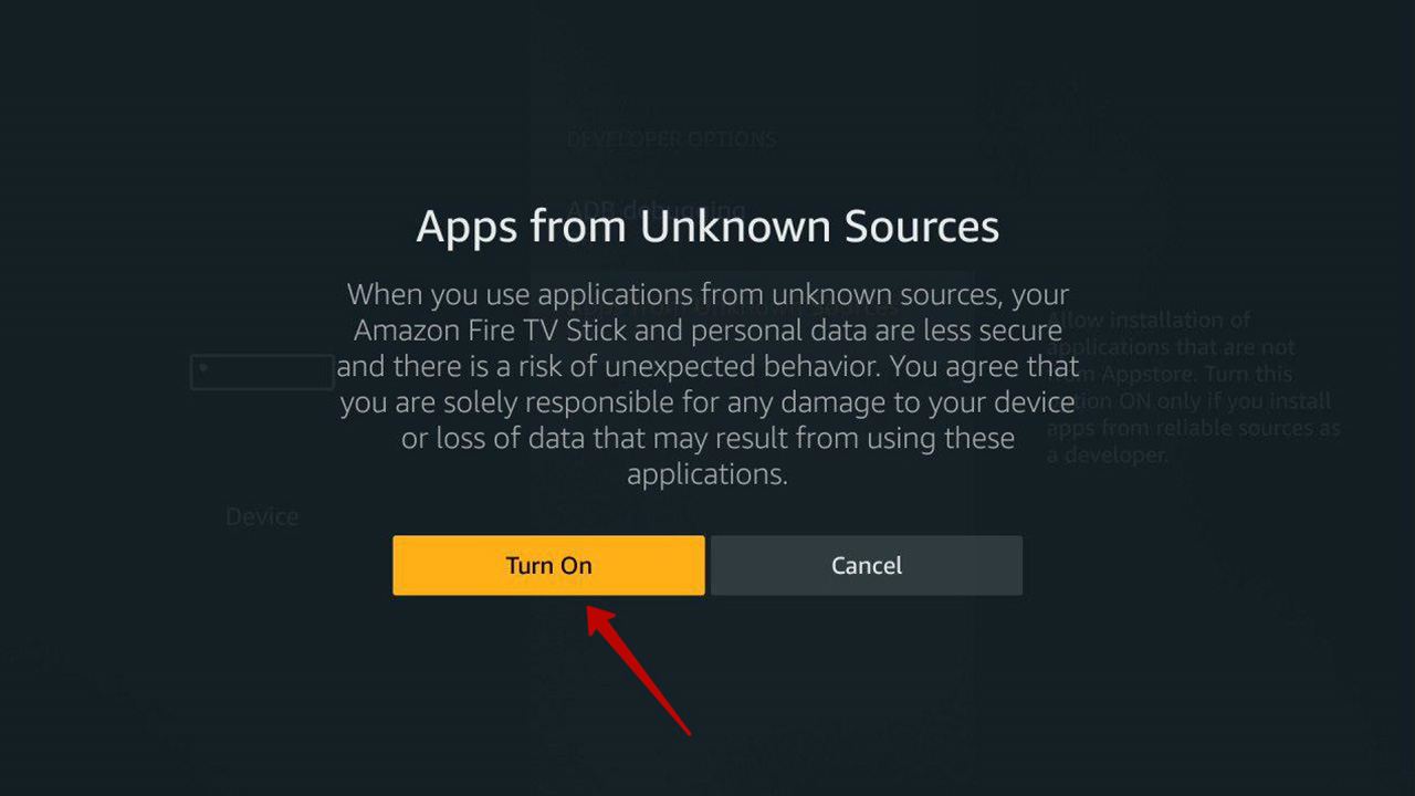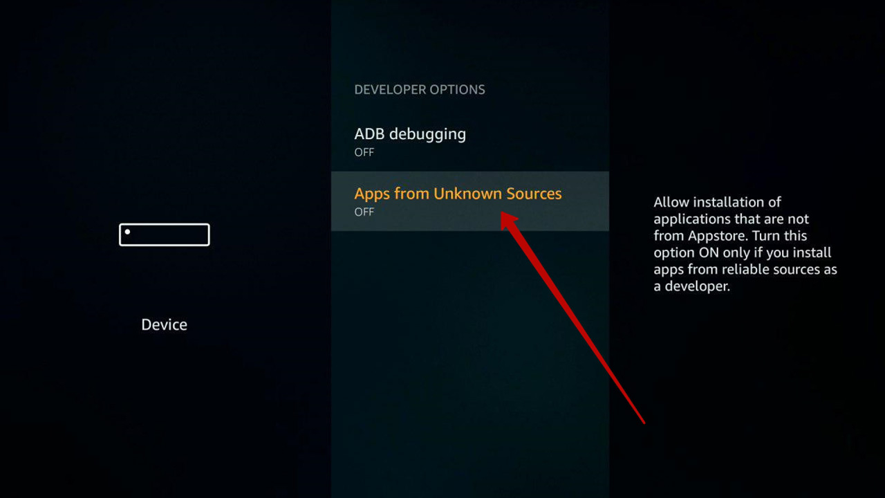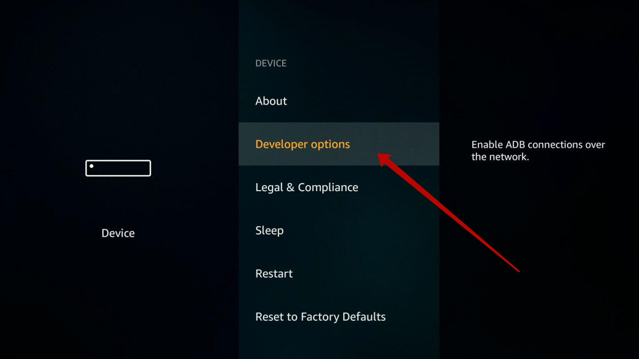 If the «Developers options» category is hidden, open «About» and select for 6-7 times the «FireTV» item, after that the «Developers options» category will appear.