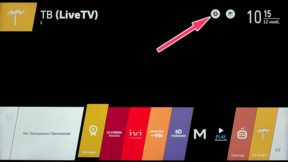 After turning on the TV, press the «Home» button on the remote control - the main screen of Smart TV will appear. Use your remote to select the «Settings» icon in the upper right corner of the screen.